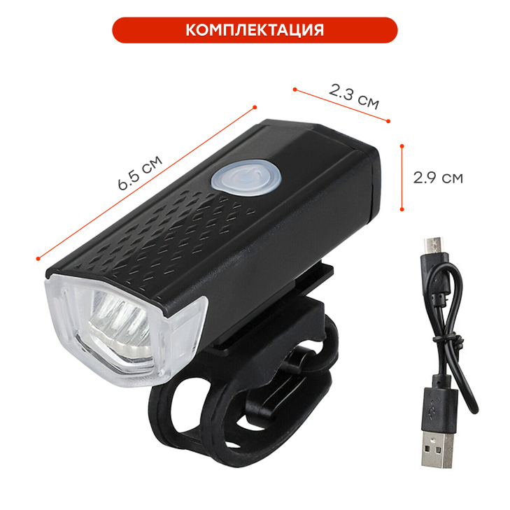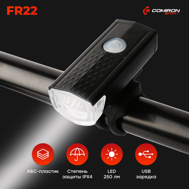 Фонарь передний COMIRON "FR22" корпус: ABS, IPX4; свет: LED, 250lm; аккумулятор, USB, влагозащищённый, 3 режима, OPP /уп 100/200/739207