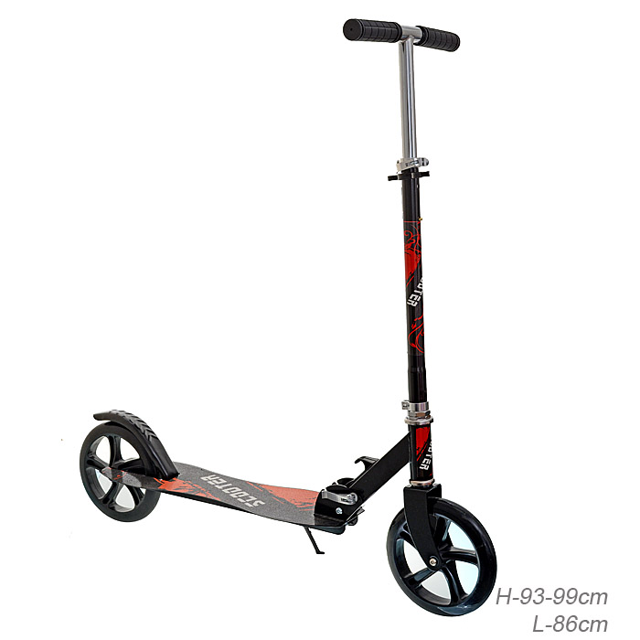 Самокат с Т–образной телескопической ручкой, регулируемой по высоте до 97 см и полиуретановыми колесами.