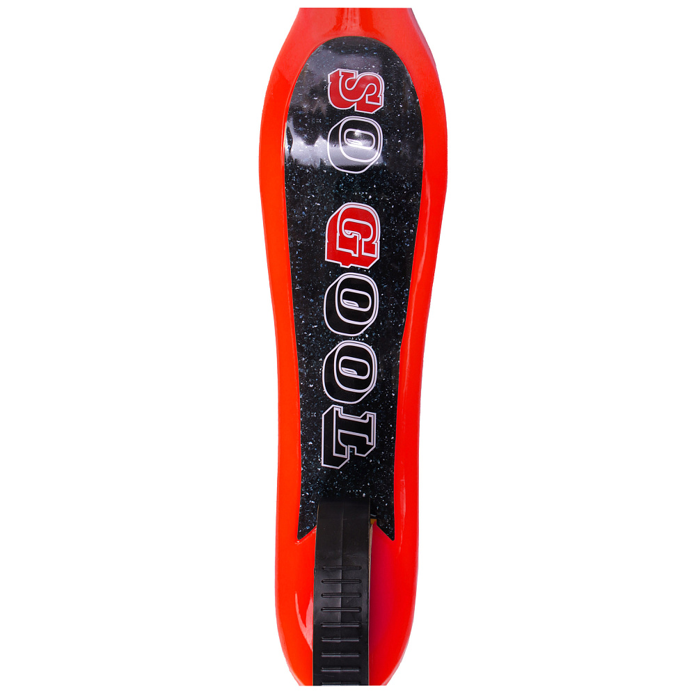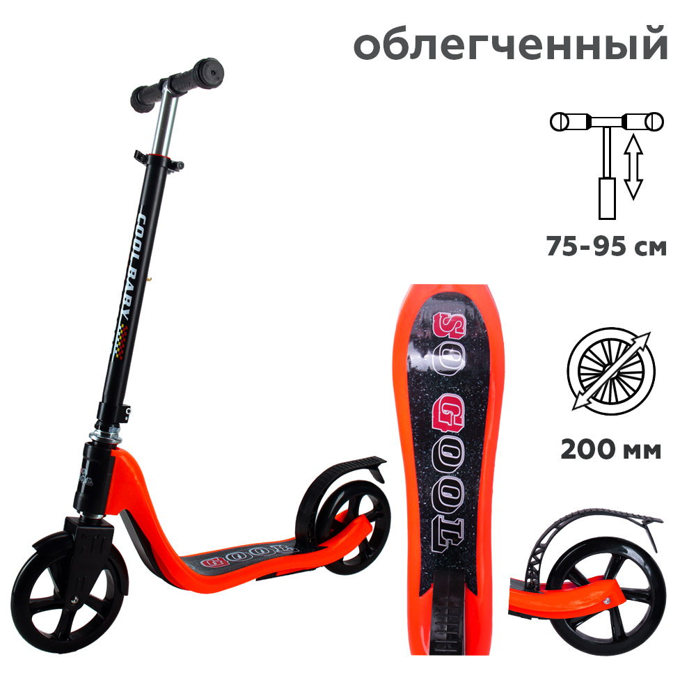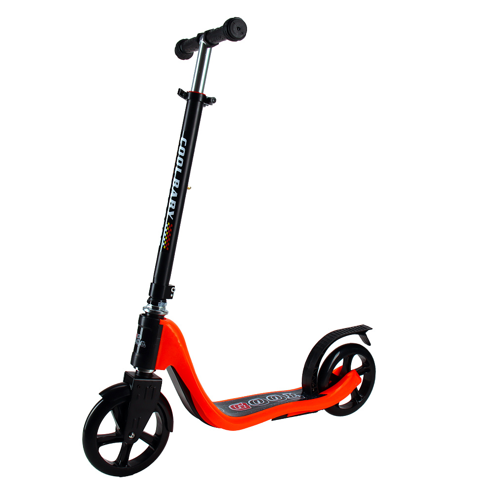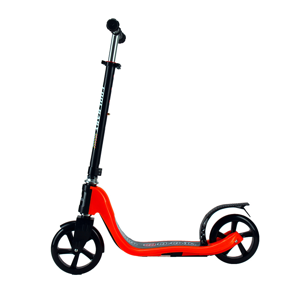 Самокат с Т–образной телескопической ручкой, регулируемой по высоте до 96см, вращающейся на 360 град. и полиуретановыми колесами на 180 мм. Он имеет простую, но надёжную конструкцию.