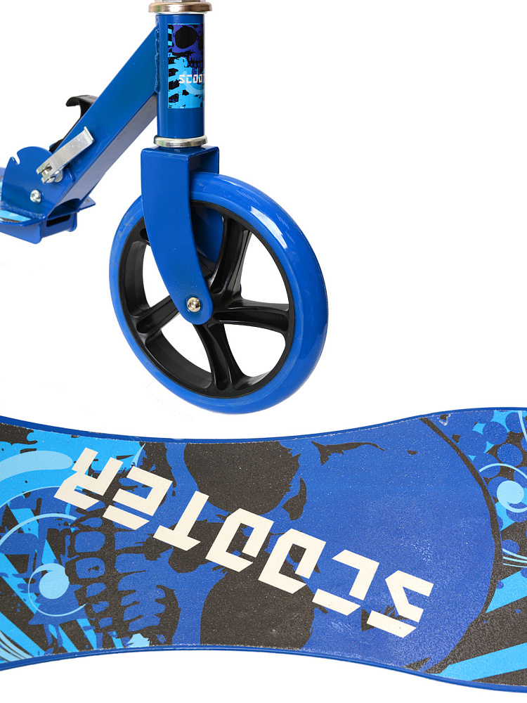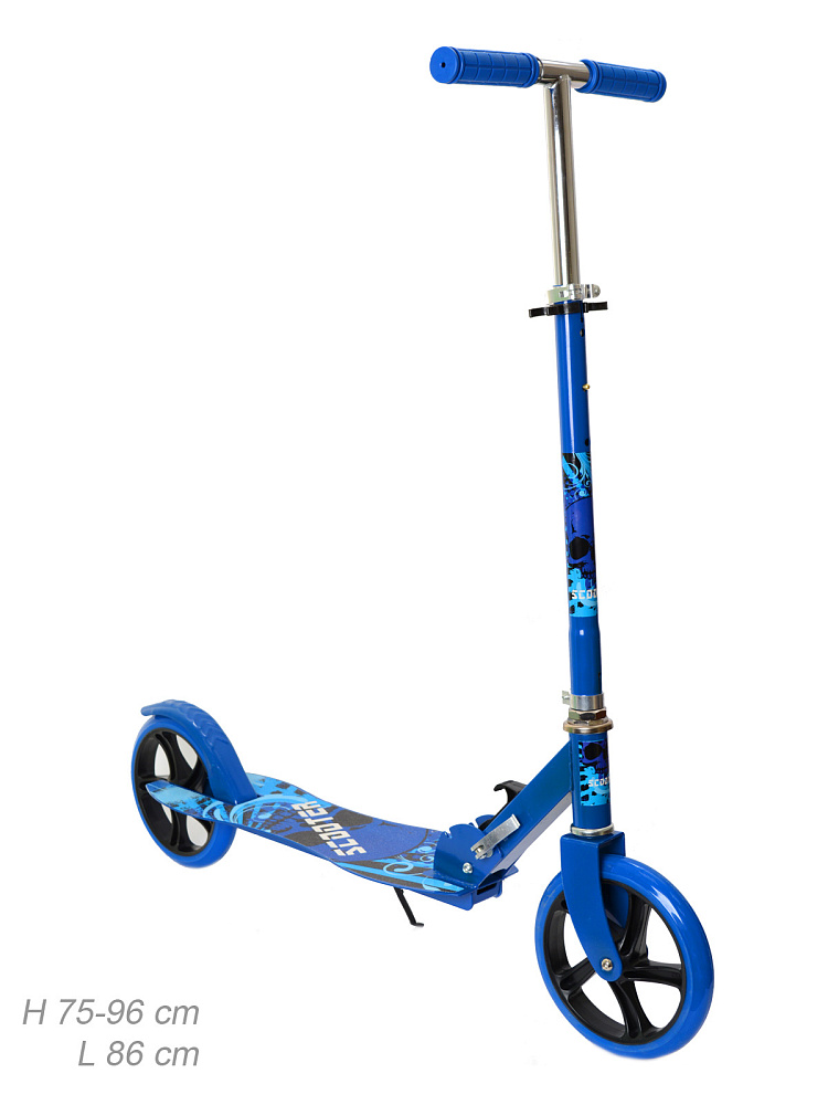 Самокат с Т–образной телескопической ручкой, регулируемой по высоте до 97 см и полиуретановыми колесами.