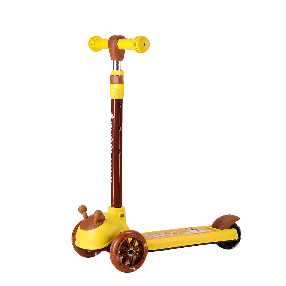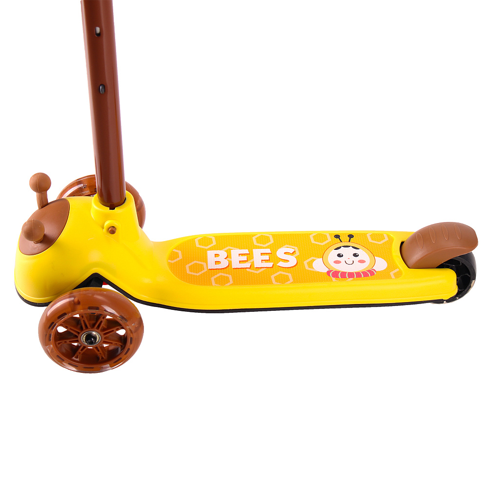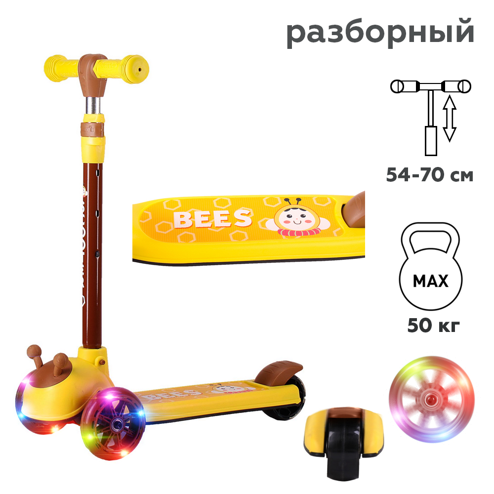 Самокат с Т–образной телескопической ручкой, регулируемой по высоте до 77см и полиуретановыми, светящимися при движении колесами.