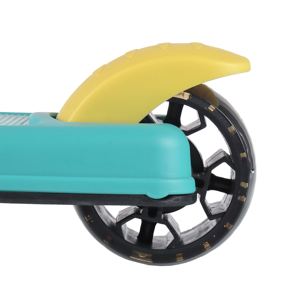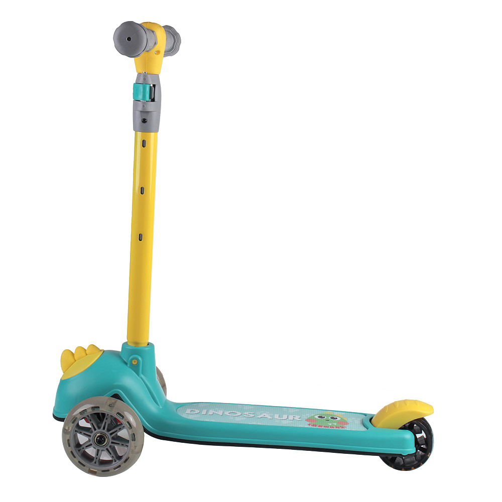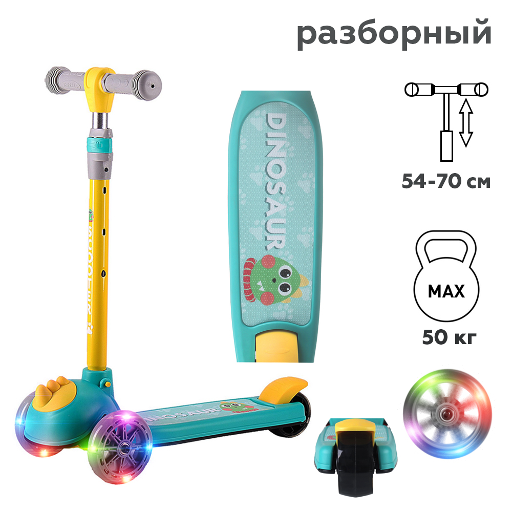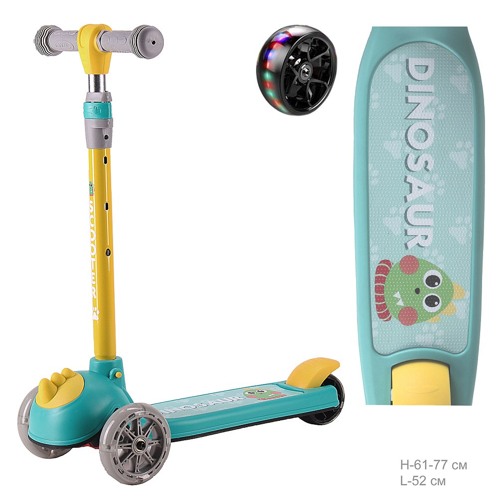 Самокат с Т–образной телескопической ручкой, регулируемой по высоте до 77см и полиуретановыми, светящимися при движении колесами.