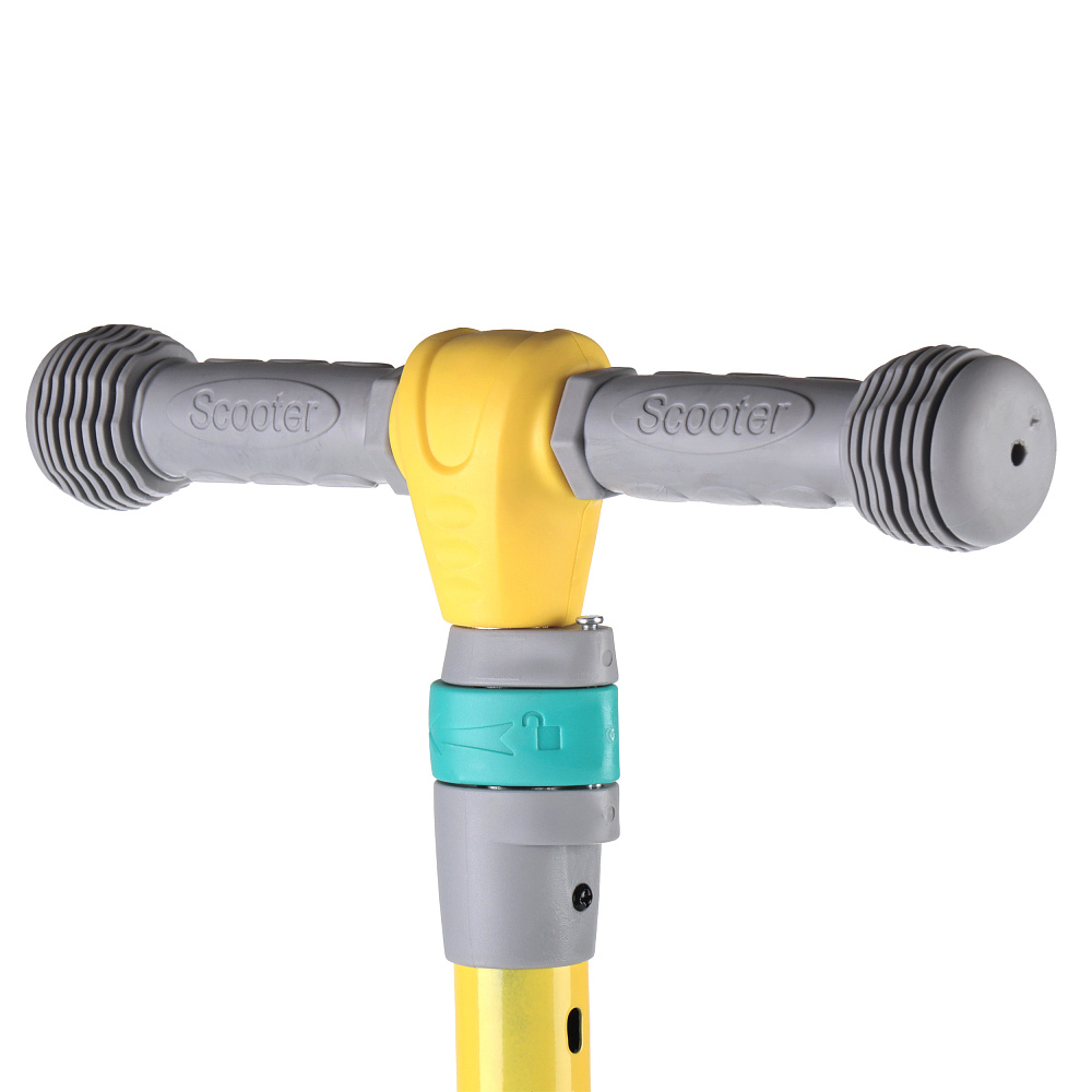 Самокат с Т–образной металлической телескопической ручкой с мягкими накладками, регулируемой по высоте и полиуретановыми колесами.
