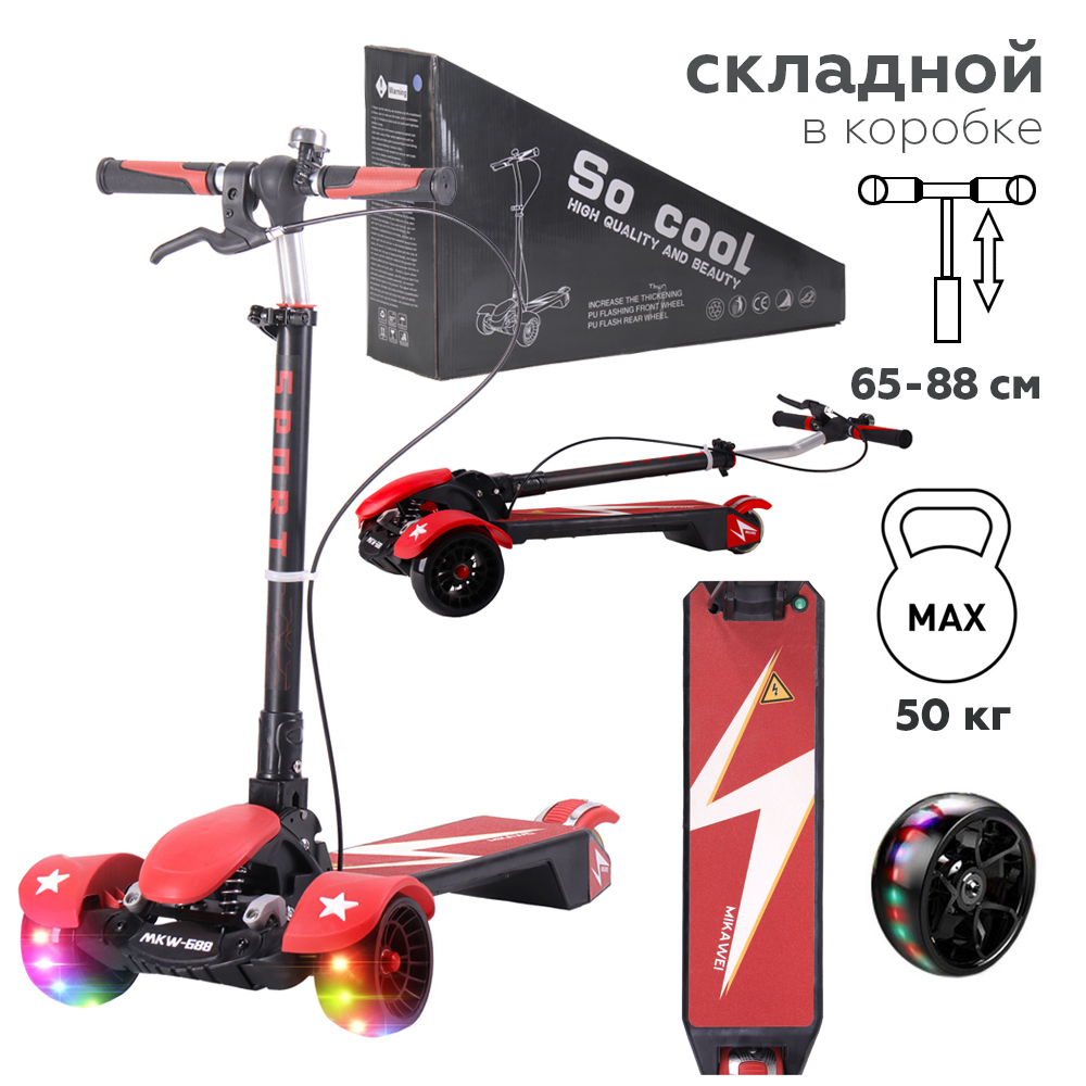 Самокат полюбится ребенку – он никогда не падает, яркого цвета, а его три колеса светятся во время движения!Благодаря складной ручке, самокат очень компактен во время перевозки или хранения!