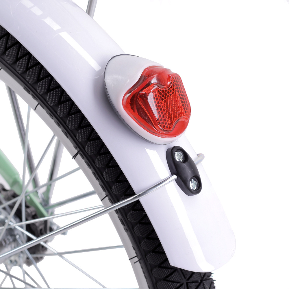 Велосипед доступен в трех нежных оттенках: нежно-розовом, лунной зелени и цветочном красном. Высококачественное лакокрасочное покрытие защищает велосипед от коррозии и сохраняет его яркий внешний вид на долгие годы. Элементы из экокожи, такие как грипсы и седло, придают велосипеду элегантный и современный вид. Белые педали типа small diamond, полноразмерные крылья и хромированные элементы завершают образ этого стильного городского велосипеда.