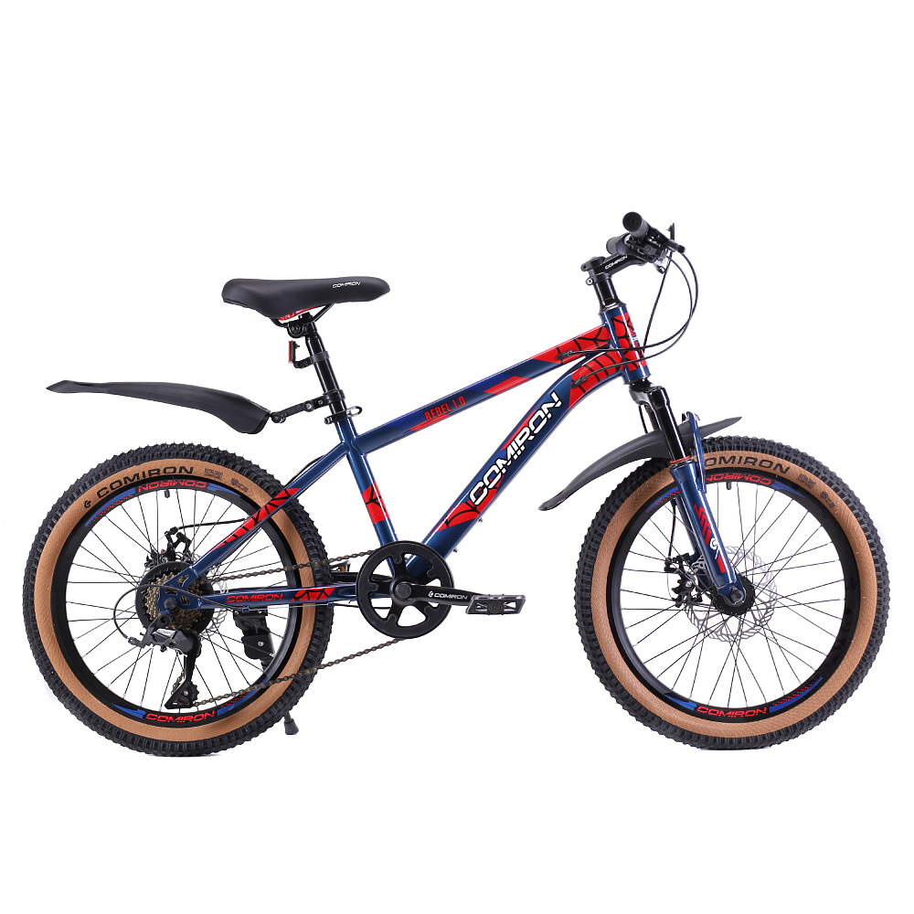 Велосипед 20" рама 12" 7sp COMIRON REBEL– детский горный велосипед на стальной раме с 7-скоростной трансмиссией, дисковыми тормозами, амортизационной вилкой и «супергеройским» дизайном.