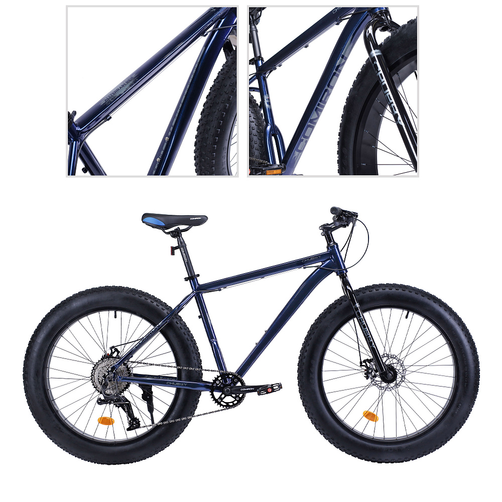 COMIRON CHUBBY  - это фэтбайк на алюминиевой раме и с обвеской от нового мирового производителя L-TWOO, достаточной, чтобы уверенно кататься по пересеченной местности, невзирая на рельеф и неровности дороги.
