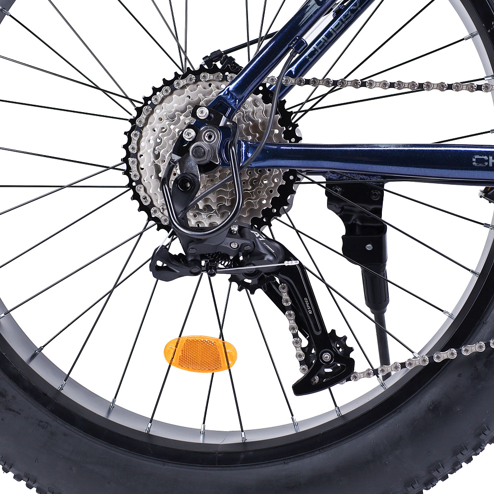 Широкие покрышки 4", благодаря высокой проходимости, позволяют ездить по любым дорогам и летом, и даже зимой. Облегчённая трансмиссия 1*10sp  с кассетой 11-42T позволяет легко крутить педали, даже в серъёзную гору.