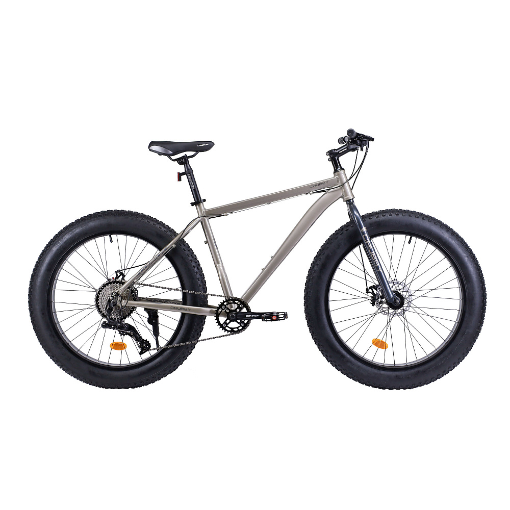 Широкие покрышки 4", благодаря высокой проходимости, позволяют ездить по любым дорогам и летом, и даже зимой. Облегчённая трансмиссия 1*10sp  с кассетой 11-42T позволяет легко крутить педали, даже в серъёзную гору.