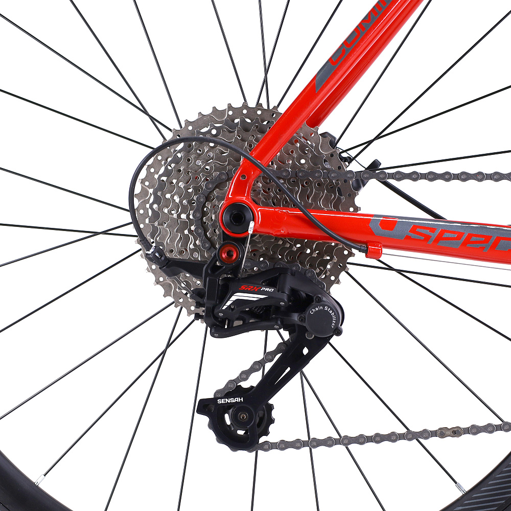 Собран на продуманной алюминиевой раме с полированными швами и выгодно отличающимся лакокрасочным покрытием. Оборудован карбоновой вилкой, надёжными компонентами, внутренней проводкой тросов, проверенной гонками трансмиссией SENSAH 1х11, дисковыми тормозами, бонками на вилке и раме под багажники для велотуризма.